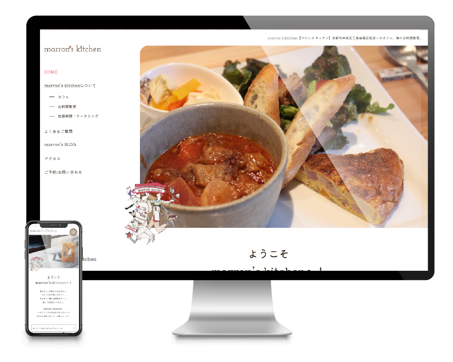 京都市内のお料理教室「marron's kitchen」様のWEBサイト。 こだわりが随所にみられるご自宅でのお料理教室は、ワイワイ楽しみながらしっかり学ぶことができ、お食事タイムはまるでホームパーティ! イラストレーター「harunachiko(ハルナチコ)」さん作のオリジナルのイラストが楽しい雰囲気を更に盛り上げてくれています。