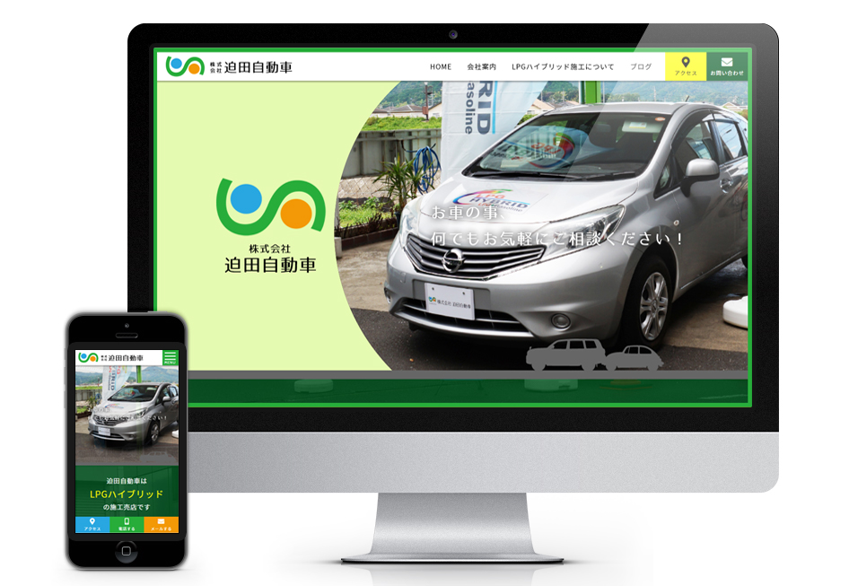 京都舞鶴の迫田自動車さまの新規サイト制作。お財布にも環境にも優しい「LPGハイブリッド施工」の推進をはじめ、一般整備・車検、保険小売業、新古車販売などなど、、お車のことを何でも相談できる車屋さん。